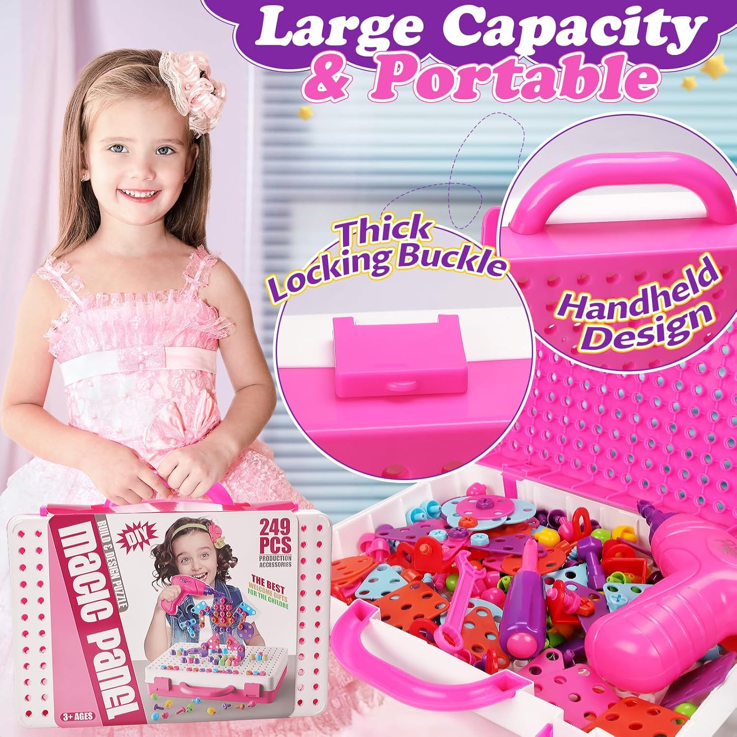- 【249PCS kids Toolbox】This magic montessori play toolbox includes a drill, plum open-end wrench, screwdriver, screws, nuts, toy blocks, colorful mushroom nails, etc. The perfect hands-on and creative toy set to keep your child busy.