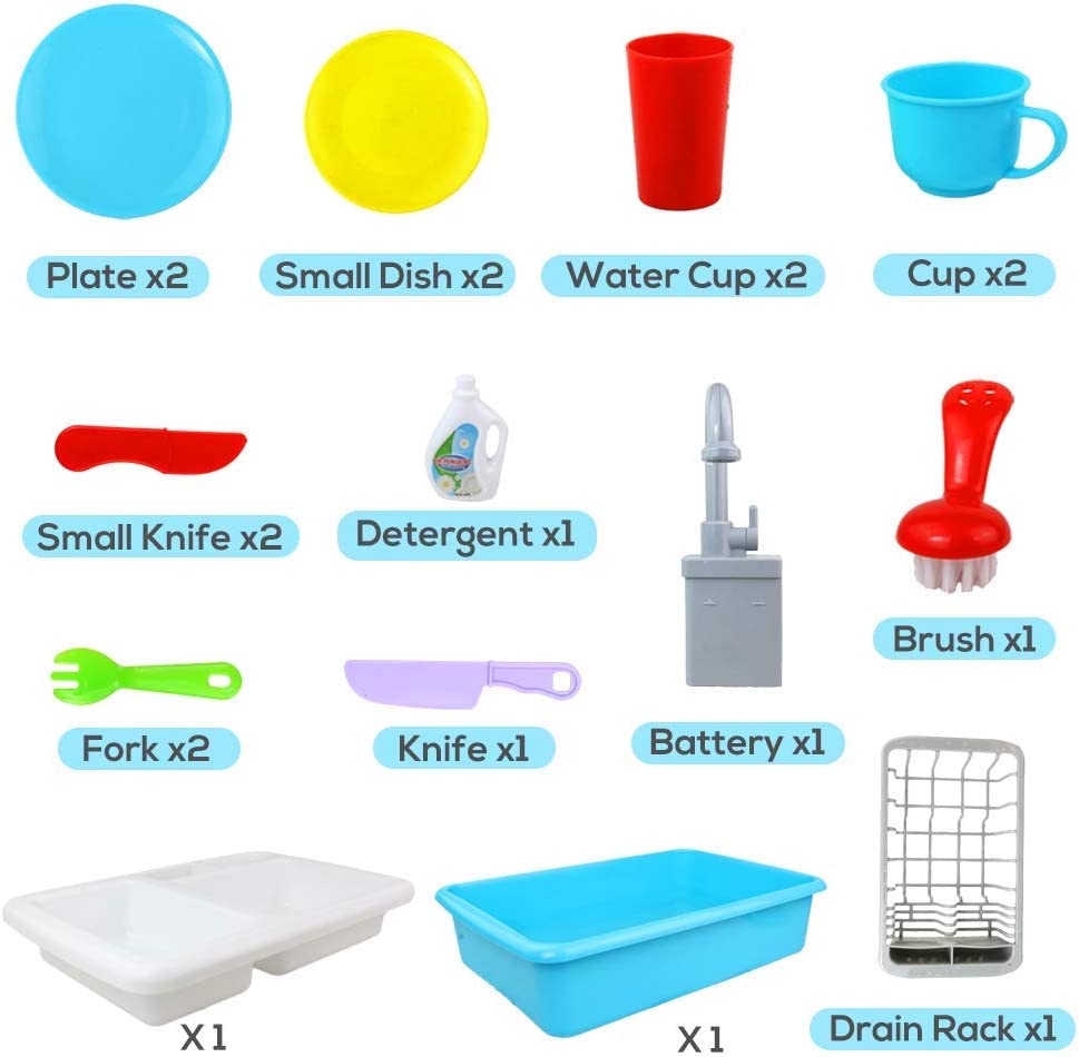 - SINK TOY WITH RUNNING WATER -- Play Sink is a battery-operated kitchen sink kids toy that needs no external plug or electricity to function. The water sink toy comes with an upgraded real faucet and an automatic water circulation system, which helps to save water and keep uniform speed. Using warm water to play has the potential to prevent children from contracting cold. Water recycle system and well-sealed battery compartment give your child lasting fun.