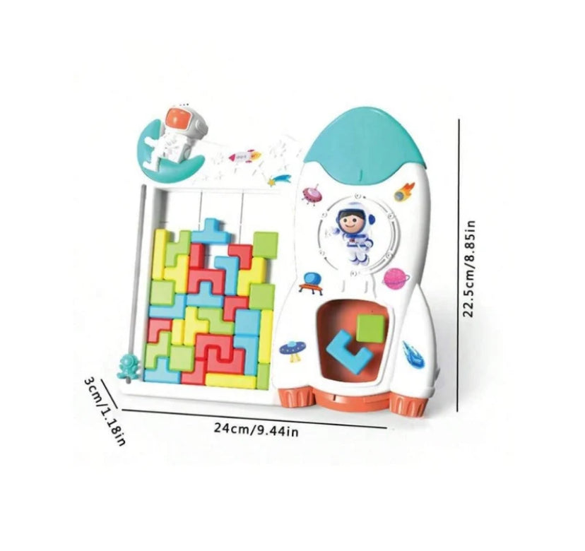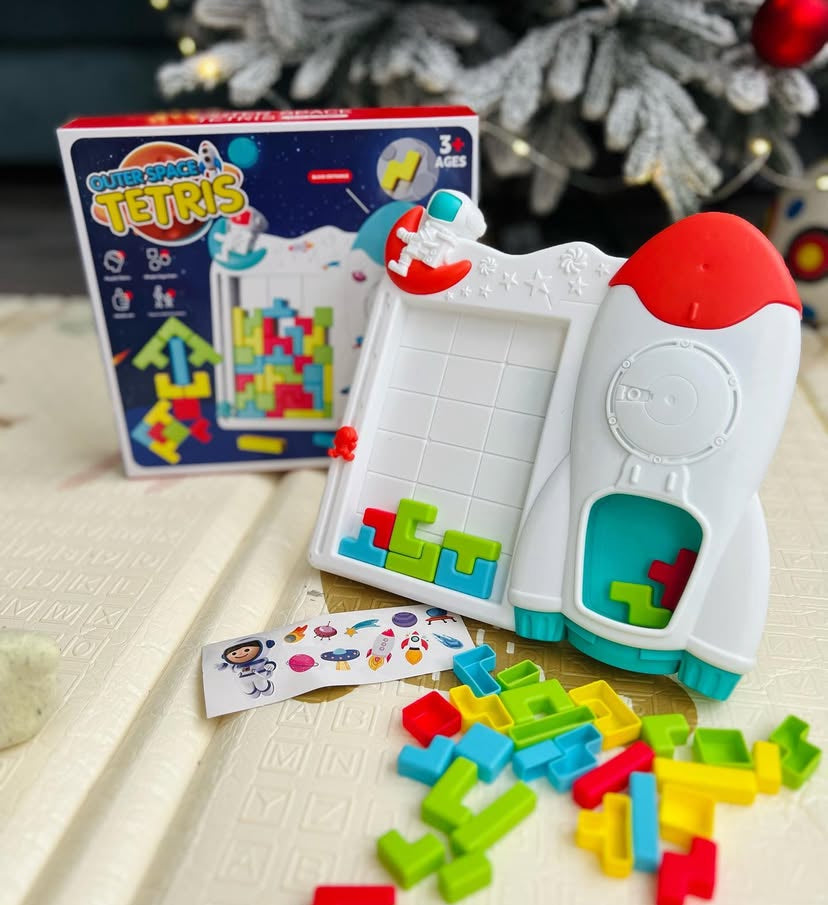 This toy combines the classic Tetris concept with a space-themed twist. It features a vertical grid board shaped like a rocket ship, where children insert variously shaped and brightly colored plastic blocks (red, green, yellow, blue) to match and stack them correctly — just like in the original Tetris game.