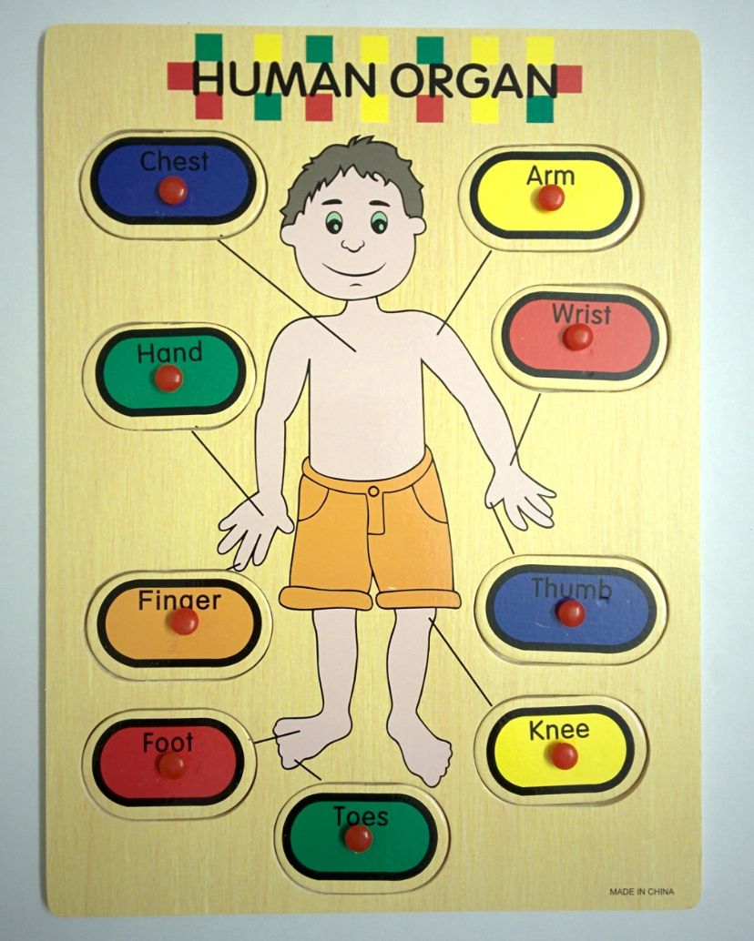 This is an educational wooden puzzle board designed to help children learn and identify different body parts.
