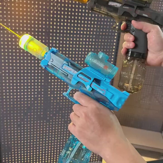 - Cool LED Lights + Upgraded Electric Water Gun: water gun is also equipped with cool LED lights, making the game more realistic and interesting. It can be used during the day and at night, providing amazing visual effects. The upgraded electric water gun has stronger power, larger water output, and strong and stable water flow. Electric Water Gun with LED Lights. Transparent Automatic Squirt Guns High.