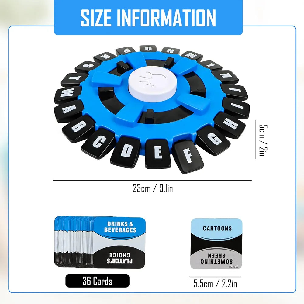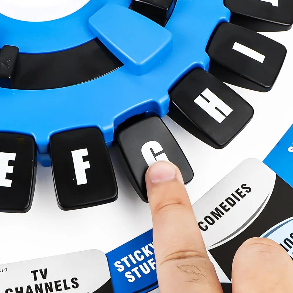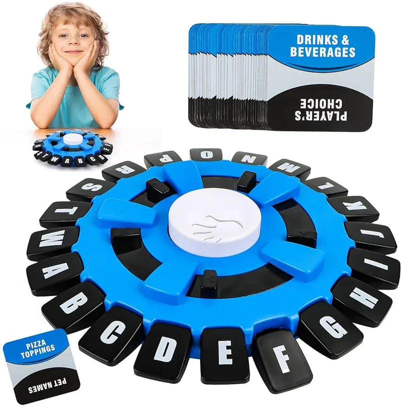 The first player presses the timer, says a word that fits the category (e.g., "Mozzarella"), and presses down the first letter of that word (e.g., "M").